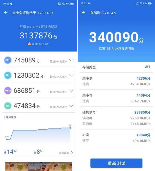 在大容量电池,与系统调校优化的双重加持下,红魔10S Pro+在续航测试中,取得了良好的成绩。