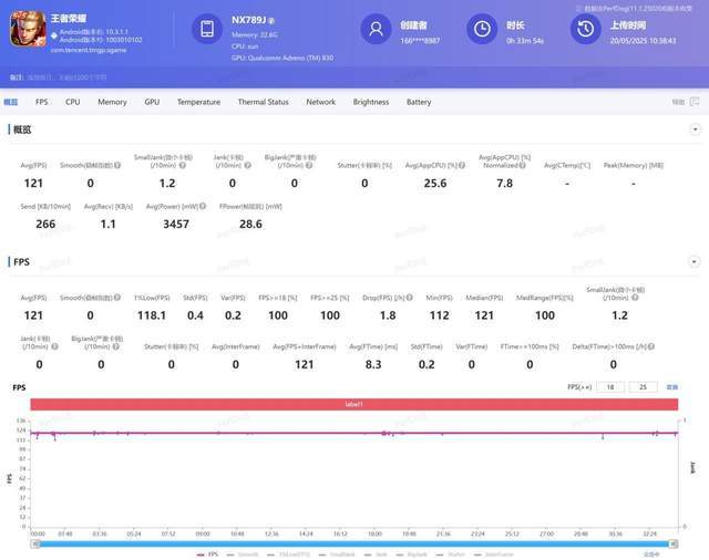 30分钟《王者荣耀》测试结束后,红魔10S Pro+的平均帧率为121帧,1%Low帧为118.1帧,帧率图稳成一条直线,几乎没有波动,可以说是相当轻松。