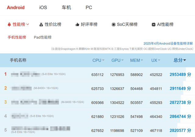 不难看出,目前榜单第一的,是一台搭载骁龙8至尊版处理器的机型,跑分成绩为2953489分,与红魔10S Pro+的3137876仍有着明显差距。