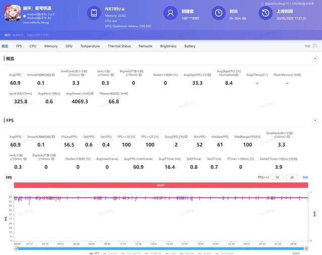 30分钟《崩坏:星穹铁道》测试结束后,红魔10S Pro+的平均帧率为60.9帧,1%Low帧为56.5帧,测试流程中出现了一定的小幅瞬时波动,但对实际游戏体验几乎没有影响。