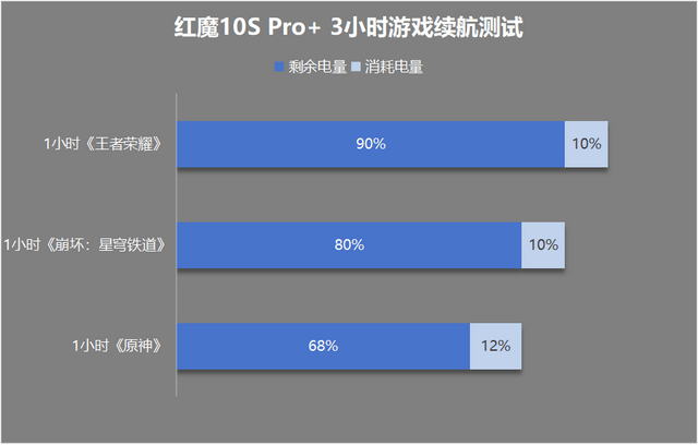 而在安兔兔3小时游戏续航测试中,同样测试环境下,使用红魔10S Pro+游玩1小时最高画质《王者荣耀》,耗电10%;1小时高画质《崩坏:星穹铁道》,耗电10%;1小时高画质《原神》,耗电12%。