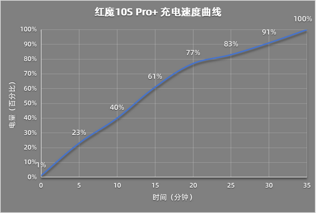 可以看出,红魔10S Pro+的充电策略非常激进,开始充电5分钟,电量就来到了23%;10分钟时,电量来到40%;在20分钟时,电量来到77%,充电速度开始放缓。