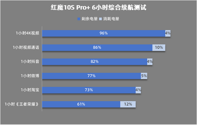 在安兔兔6小时综合续航测试中,室温26℃,且满电状态下,使用红魔10S Pro+播放1小时4K视频,耗电4%;1小时视频通线小时《王者荣耀》,耗电12%。