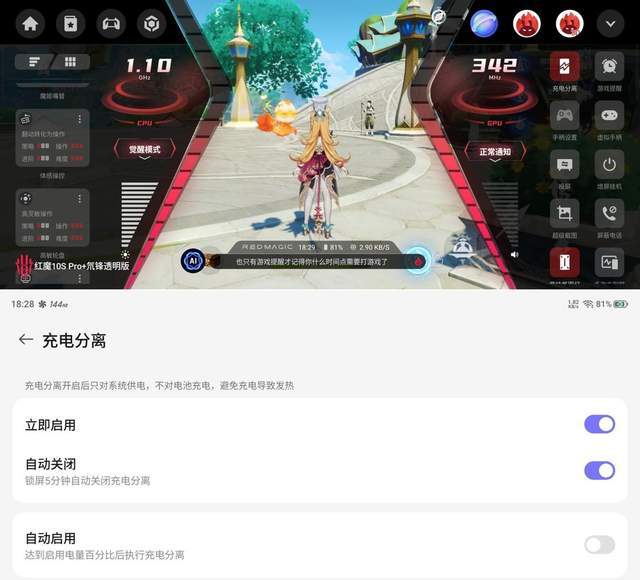 在连接充电器,并开启充电分离功能后,充电器将绕过电池,直接为手机主板进行供电,这不仅能够一举解决边充边玩的发热问题,还能够有效延长电池寿命。