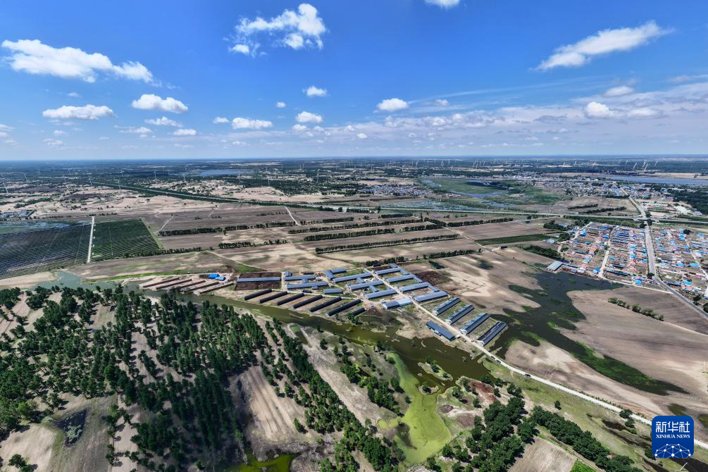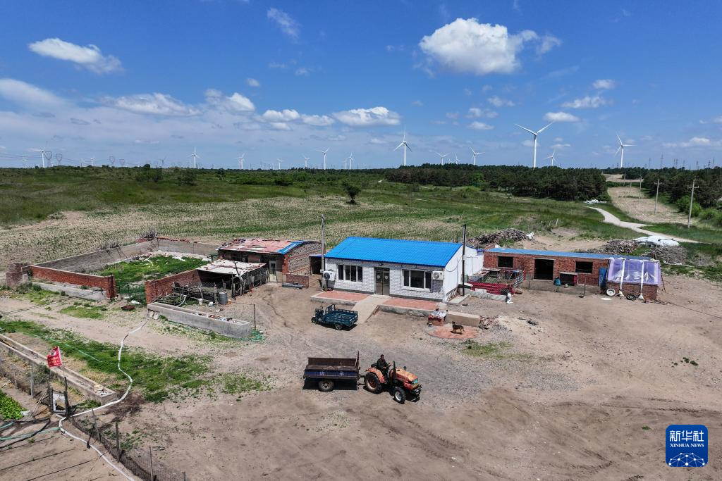 这是6月4日拍摄的阜新市彰武县阿尔乡镇阿尔乡村“种养加”一体化产业园(前蓝色大棚区域,无人机照片)。
