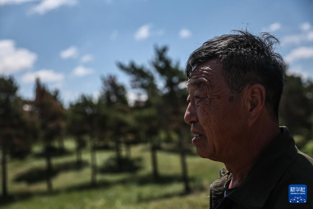 6月4日,李东魁在阜新市彰武县章古台镇章古台林场查看树木的生长情况。