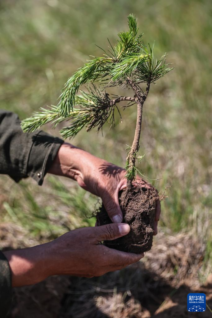 6月4日,李东魁在阜新市彰武县章古台镇章古台林场补种树苗。
