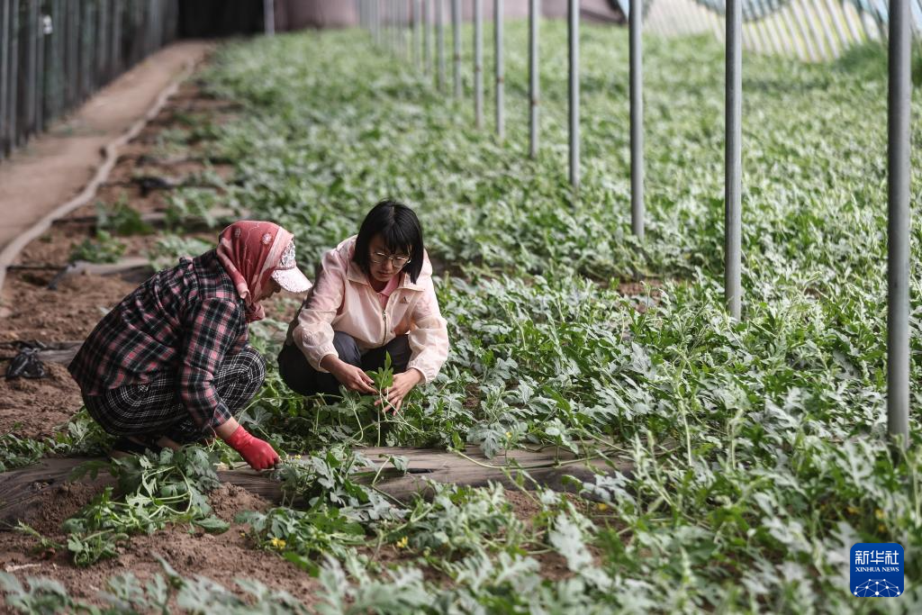 6月3日,李明明(右)与种植工人在“种养加”一体化产业园内的西瓜大棚内查看西瓜长势。