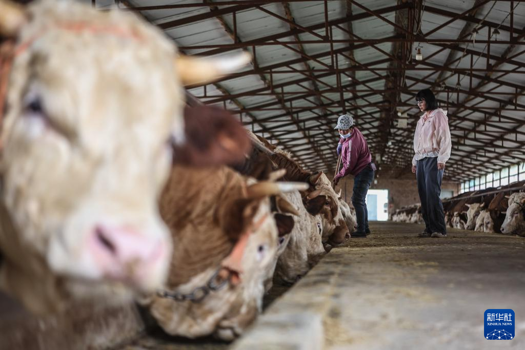 6月3日,李明明在“种养加”一体化产业园内的养牛大棚跟养殖工人交流。