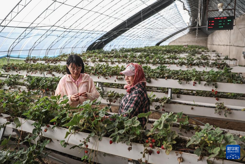 6月3日,在阜新市彰武县阿尔乡镇阿尔乡村“种养加”一体化产业园内的草莓大棚内,李明明与种植工人交流下一步的种植计划。