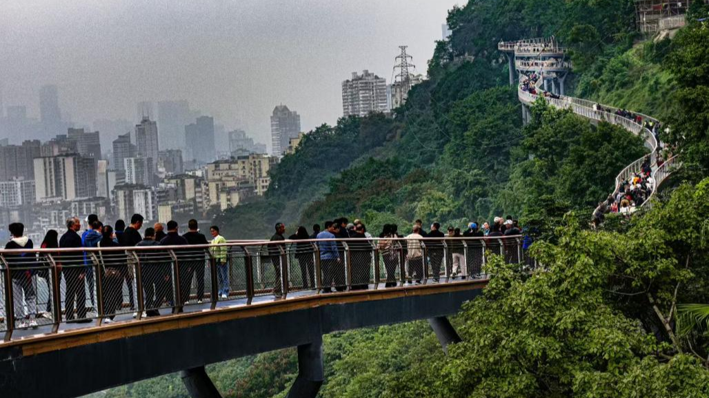 初冬的重庆,阴雨织成薄纱。11月17下午1时30分,渝中区鹅岭公园旁,一条银灰色的栈道如飘带般悬于大鹅岭山脊半空。桥上移动的伞花与远处朦胧的嘉陵江景,构成一幅流动的水墨画。