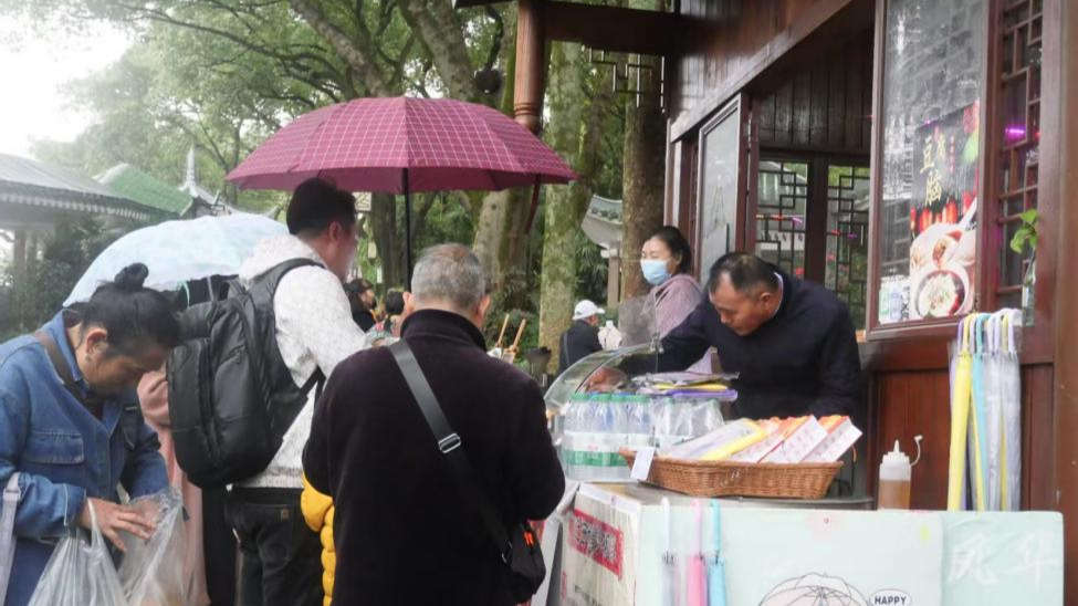 栈桥带来的不仅是游客,更提振了片区社区的活力。下午3时,尽管细雨未停,佛图关公园南门、栈桥入口处的摊贩前依然游人如织。